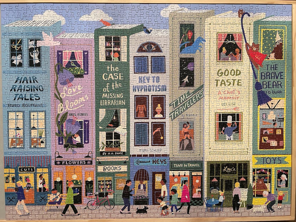 This 1000-piece puzzle showcases Victoria Ball's distinctive illustrative style, presenting a sophisticated European streetscape rich in architectural and botanical detail. The composition strategically layers a bakery, greenhouse, and café within a harmonious palette of deep purples and blues, creating visual depth and complexity ideal for experienced puzzlers seeking both aesthetic appeal and engaging assembly.