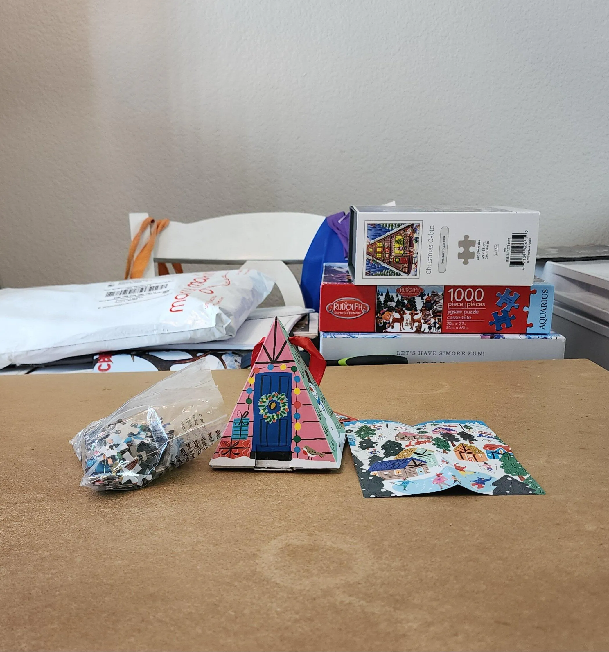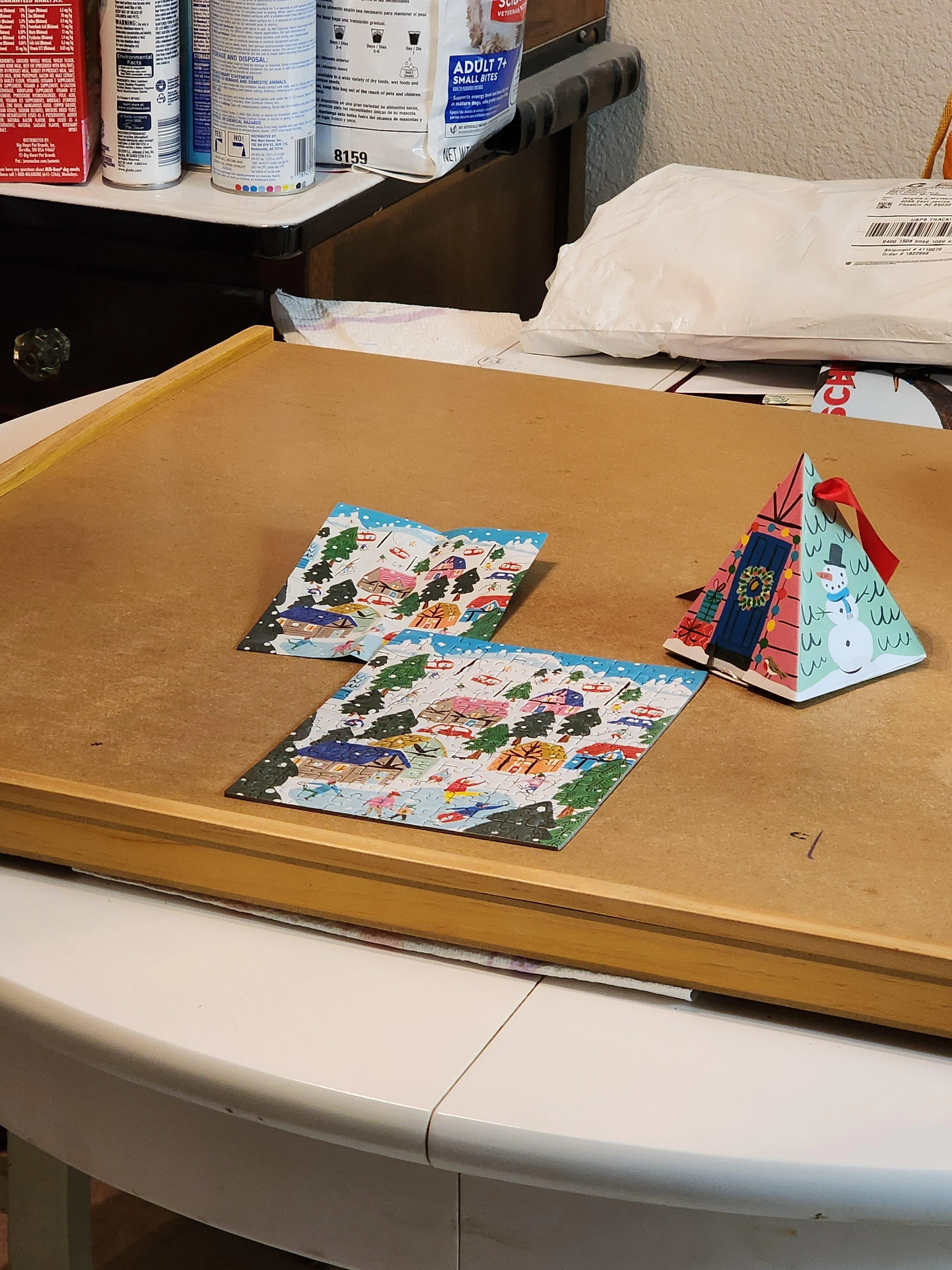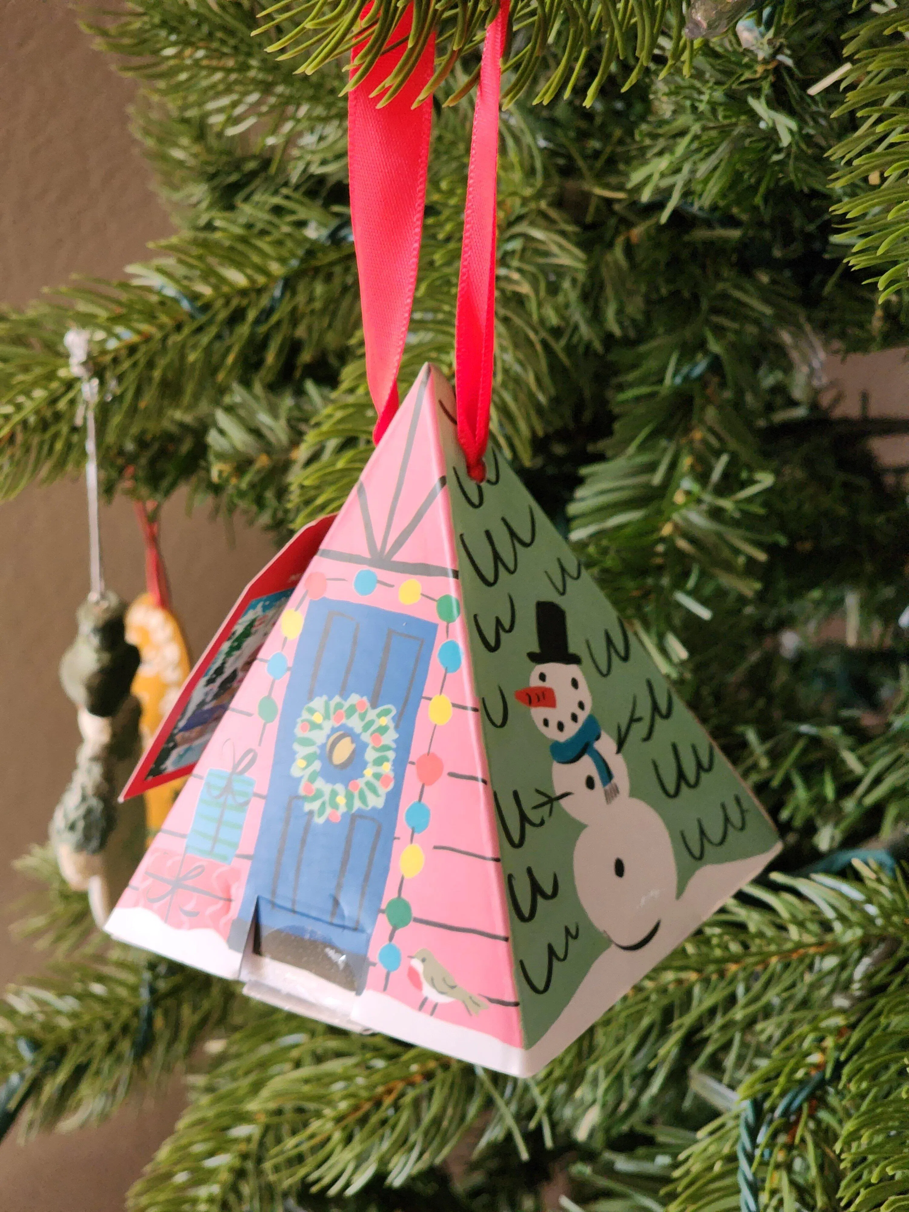 The Alpine Cottage Puzzle Ornament, featuring Louise Cunningham Starling's artwork, contains 130 pieces and showcases a miniature pyramid-shaped design adorned with Christmas Trees, ornaments, and lights in festive colors. Enjoy a charming depiction of alpine living during the winter season with this colorful mini puzzle.