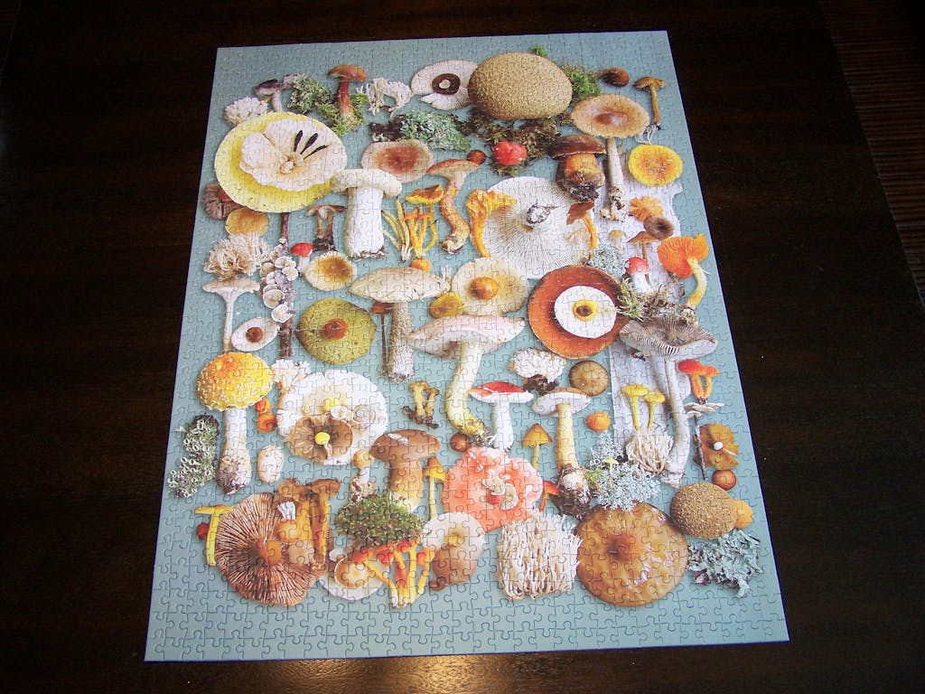 The glorious image on the Foraged 1000 Piece Puzzle features all the things Sherrie Sanville (aka Shroom Mama) loves about mushrooms. As a mushroom enthusiast, she walks her 150 acre property in Michigan, photographing collections of mushrooms, flowers and other treasures that she happens upon.
