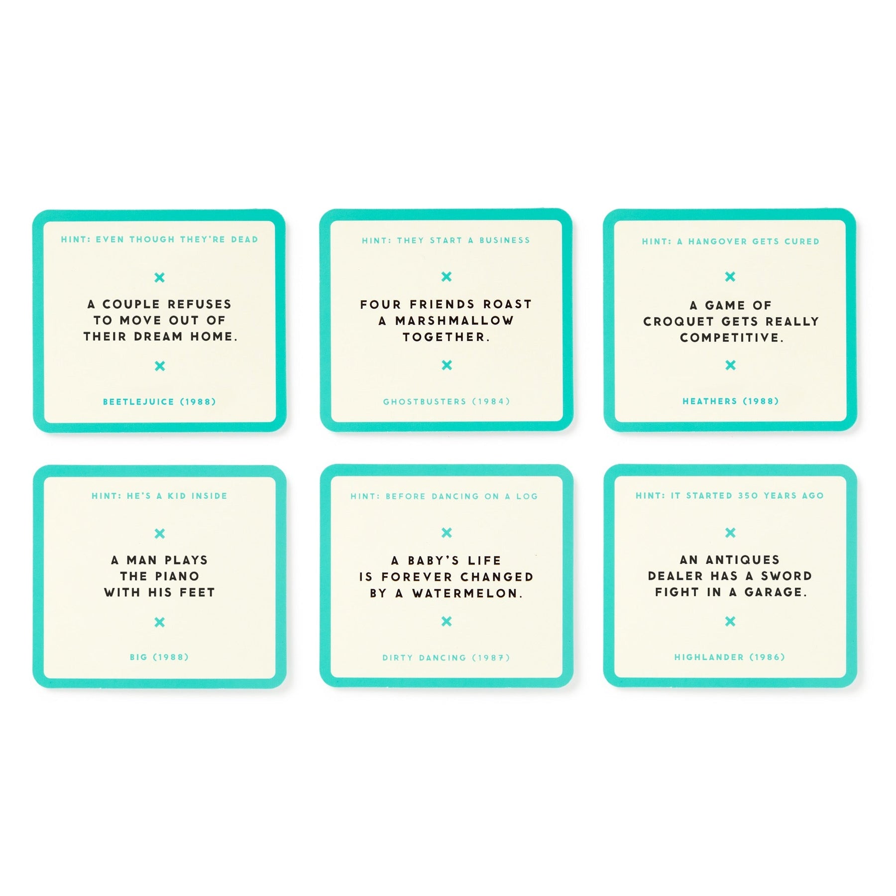 Mini Poorly Explained Movies - 80s Edition by Brass Monkey features six teal-bordered cards with movie hints, clues, and titles like Beetlejuice (1988) and Heathers (1989), arranged in two rows for a nostalgic party game.